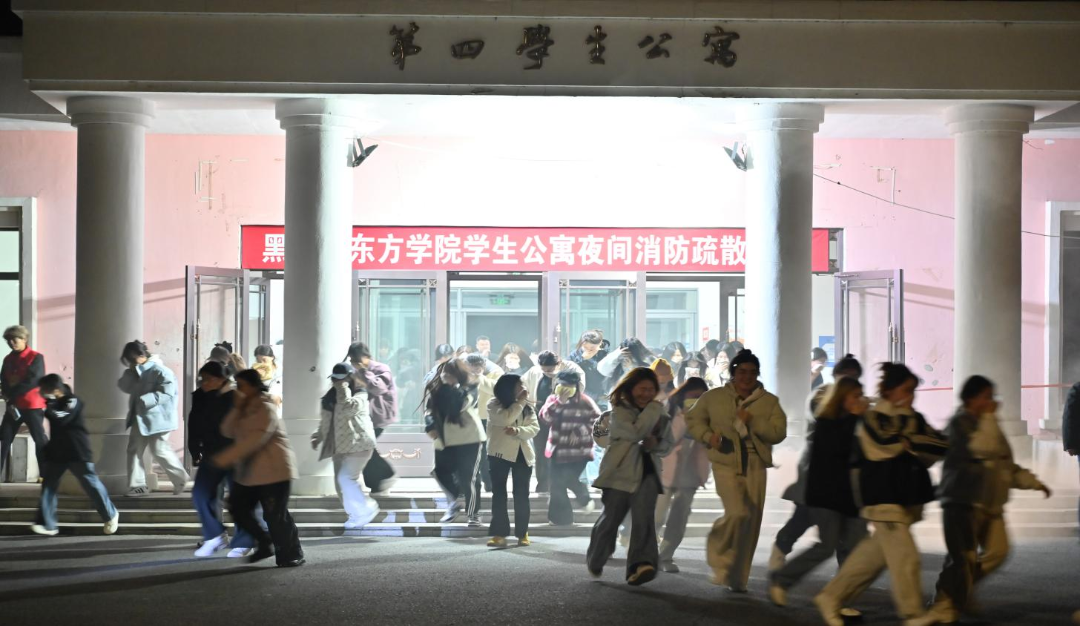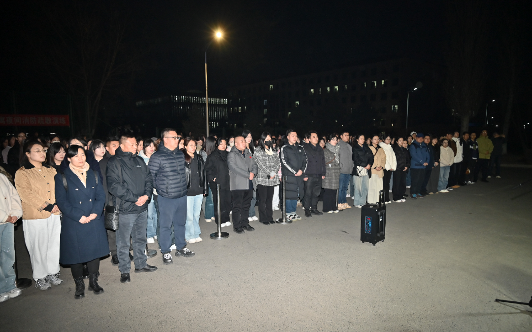 演练开始前,学生处副处长王洪伟面向全体参演师生宣读了《学生公寓夜间消防应急逃生演练方案》,详细说明了演练目标、步骤及注意事项。重点阐释了“逃生路线规划”“楼层分批疏散”及“安全自护动作”三大核心环节。随着保卫处处长张相满下达指令:“学生公寓夜间消防疏散演练现在开始!”,第四学生公寓门前火情触发烟雾装置开启,模拟火情迅速 “爆发”。学校即刻启动消防应急预案,工作人员快速打开全部消防通道门,确保出口无遮挡,在疏散引导人员的现场指挥与调度下,按“先低层、后高层”顺序分批放行,各楼层疏散工作有序展开。全体师生按照预定疏散路线,安全、快速地撤离至操场指定位置,整个疏散过程仅用时4分22秒,顺利达成预定目标。