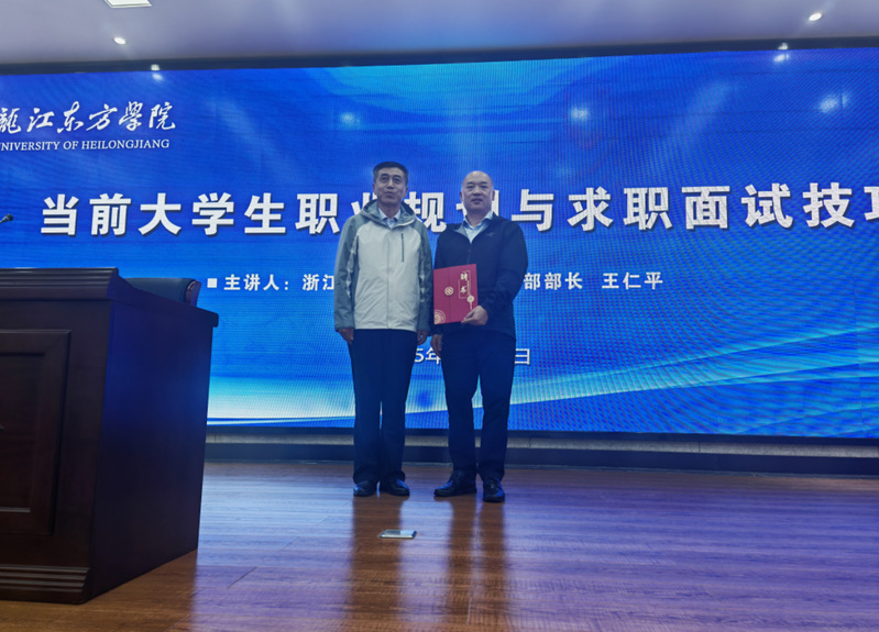 报告结束后,徐建成代表学校向王仁平颁发了“黑龙江东方学院校外就业指导导师”聘书。