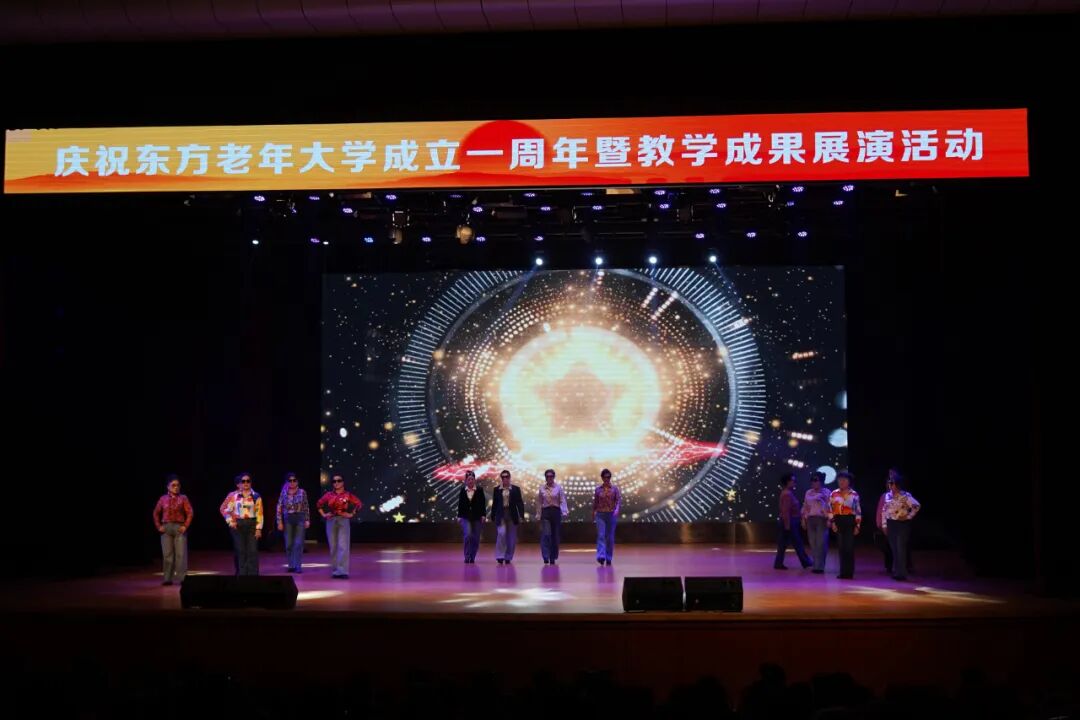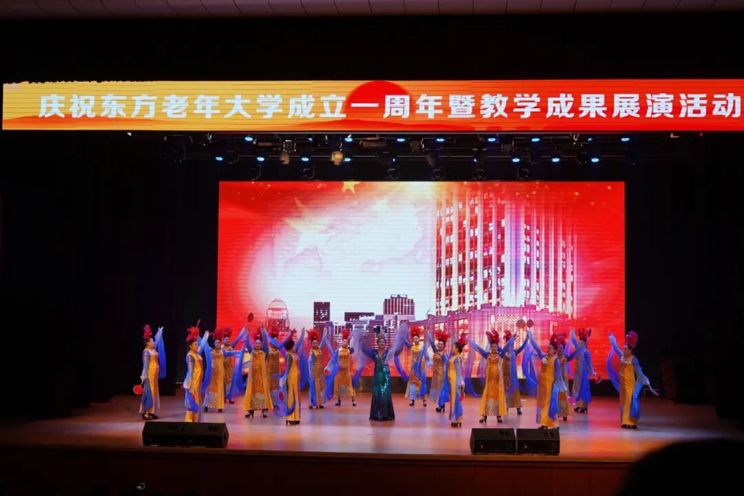 开幕式后,庆祝东方老年大学成立一周年暨教学成果汇报演出在养正讲堂举行。东方老年大学爱乐艺术团带来的《红旗颂》作品用雄壮的旋律拉开了展演的帷幕。