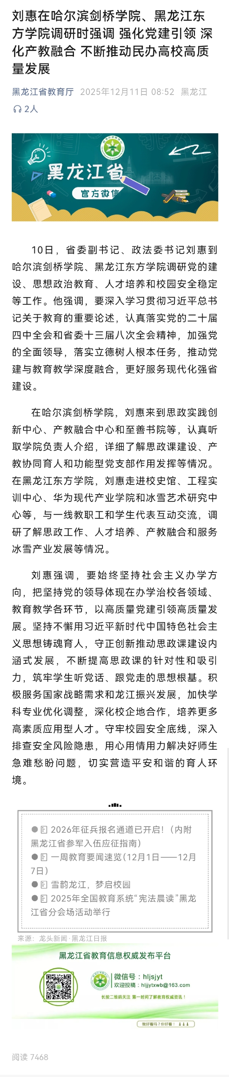 黑龙江省教育厅:刘惠在哈尔滨剑桥学院、黑龙江东方学院调研时强调 强化党建 引领 深化产教融合 不断推动民办高校高质量发展