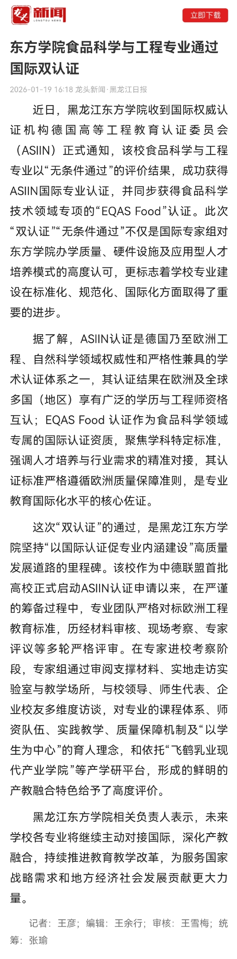 龙头新闻:东方学院食品科学与工程专业通过国际双认证