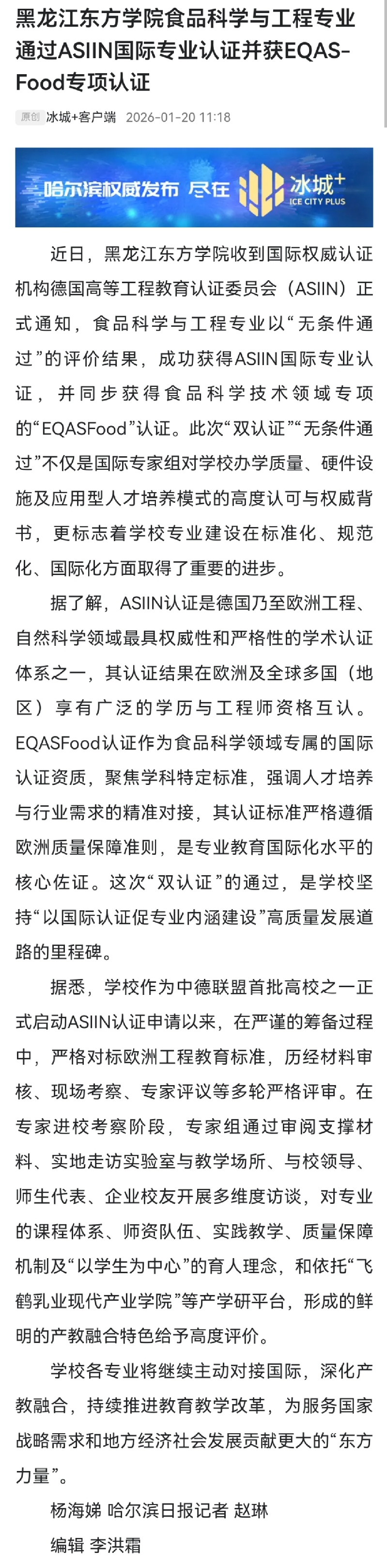 冰城+:黑龙江东方学院食品科学与工程专业通过ASIIN国际专业认证并获EQAS-Food专项认证