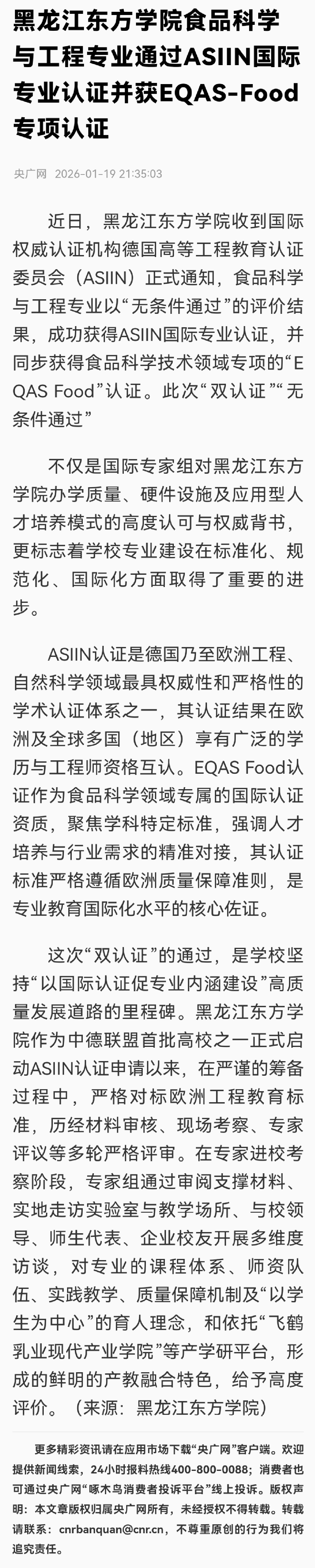 央广网:黑龙江东方学院食品科学与工程专业通过ASIIN国际专业认证并获EQAS-Food专项认证