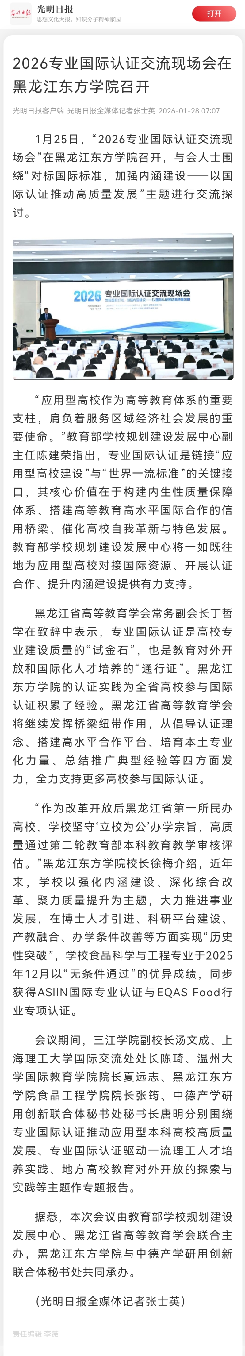 光明日报客户端:2026专业国际认证交流现场会在黑龙江东方学院召开
