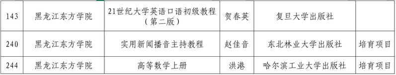 近日,黑龙江省教育厅公示了“十四五”普通高等教育本科省级规划教材及拟推荐国家级规划教材名单。我校教材建设再获佳绩,贺春英教授担任主编的《21世纪大学英语口语初级教程》(第二版)成功入选省级规划教材;洪港教授和贺树立副教授担任主编的《高等数学》(上册),以及赵佳音教授、柏洋、赵思洋副教授担任主编的《实用新闻播音主持教程》成功入选省级规划教材培育项目。
