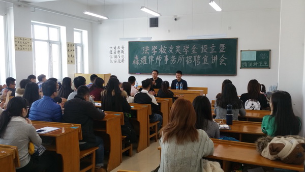 2015年12月11日,我院2011届毕业生田奇伟受法学专业校友张月的委托回母校人文学部给予法学专业设立专业奖学金,并进行了森耀律师事务所招聘宣讲。