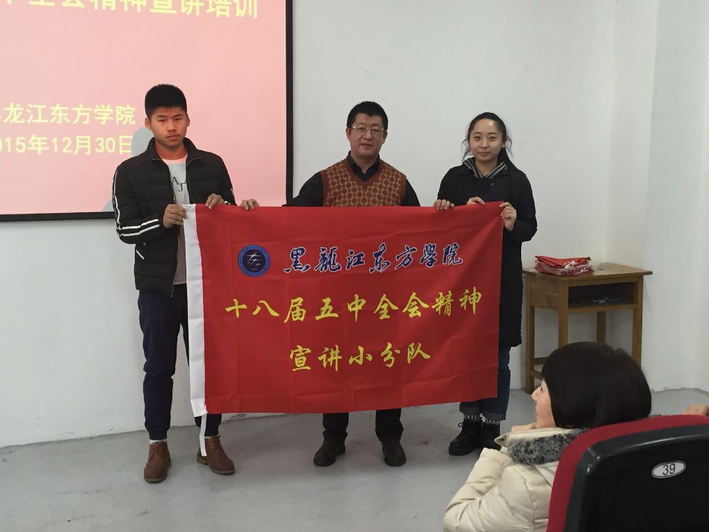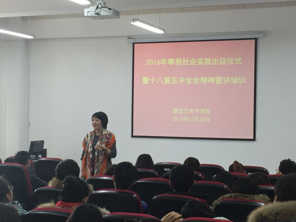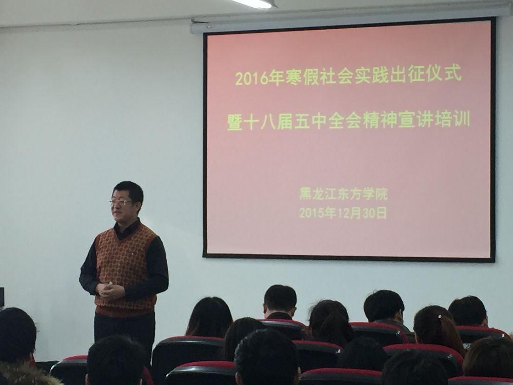 2015年12月30日上午,我院举行十八届五中全会精神宣讲小分队培训动员会暨2016年大学生寒假社会实践活动出征仪式。学务处副处长、校团委书记高文举,思想政治理论教研部副主任徐秀娟,各学部团总支书记、副书记、宣讲小分队成员参加了会议。会议由校团委副书记肖立东主持。