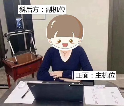 (三)主机位摄像头正面对准考生本人,面试时正对摄像头保持坐姿端正,双手和头部完全呈现在复试专家小组可见画面中。副机位摄像头从考生后方成45°放置,要保证考生和复试屏幕能清晰拍摄;