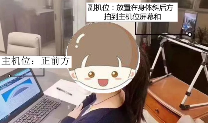 副机位:1部手机和自拍架,副机位需要安装“腾讯会议”、“钉钉”、“微信”等软件。